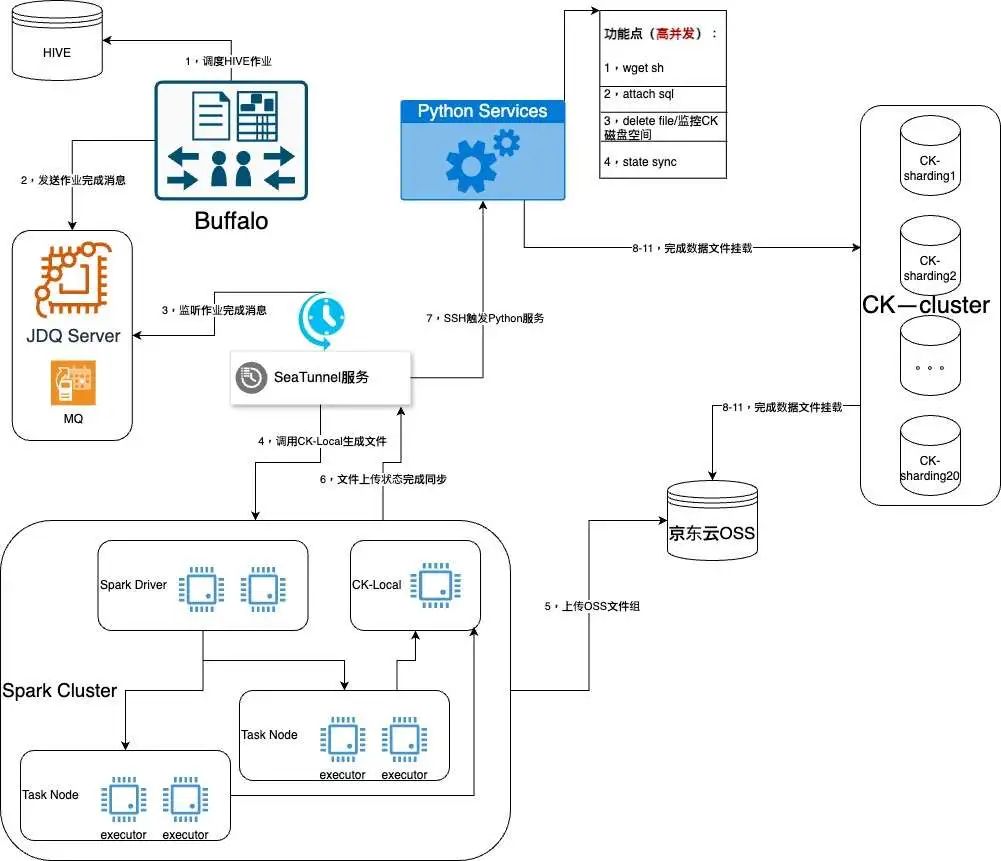 整体架构设计分为两个阶段,一阶段负责将Hive数据处理为需要的结构并通过SeaTunnel调用Spark和ClickHouse-local