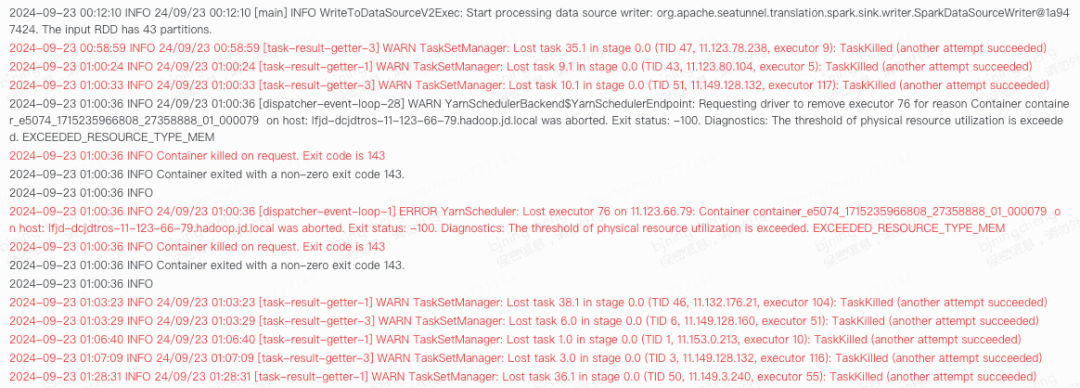 137+143问题是由于Spark参数问题,错误的参数设置导致进程外内存预留不足,同时Seatunnel代码问题,16个ClickHouse并行很容易超过YARN限制(极限40G)