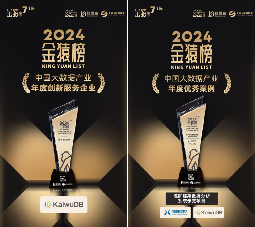 12月26日,备受关注的第七届“金猿奖”颁奖典礼在 2024 第七届金猿&魔方论坛——大数据产业发展论坛上隆重举行。KaiwuDB 荣获“2024 中国大数据产业年度创新服务企业”、“2024 中国大数据产业年度优秀案例”两大奖项。