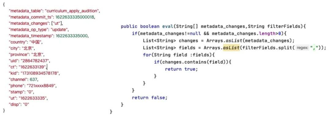 由于伴鱼内部业务大面积使用 MongoDB ,MongoDB 本身存储的是半结构化的数据,它不具有固定的 schema 。在同步 Mongo 的 oplog 时,实时数仓的 dwd 层并不需要所有字段参与,我们只会抽取日常使用率相对较高的字段进行表建设。这就可能由于不相干的数据发生变化,我们也会收到一条相同的数据记录。例如在对用户订单金额进行分类分析时,如果用户订单地址发生了变化,我们同样也会收到一条业务日志,因为我们并不关注地址维度,所以这条日志是无用的重复数据。这种未经处理的数据是不方便 BI 工程师直接使用的,甚至直接影响计算结果的准确性。所以我们针对这种非 Append-only 数据,我们进行了定制化的日志格式。在经由平台方解析后的 binlog 或者 oplog ,我们仍然定制化加入了一些元数据信息,用来让 BI 工程师更好的理解这条数据进入实时计算引擎时,对应的时间点到底发生了什么事情,这件实事到底是否参与计算。所以,我们加入了 metadata_table (原始表名), metadata_changes(修改字段名) , metadata_op_type (DML 类型) ,metadata_commit_ts (修改时间戳) 等字段,辅助我们对业务上认为的重复数据,做更好的过滤。