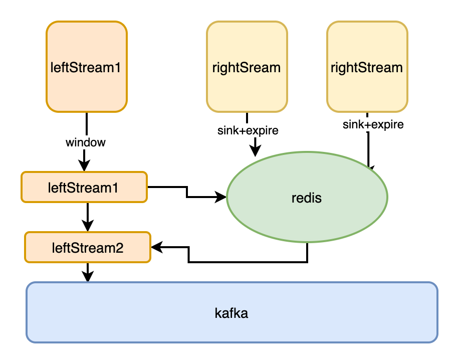 伴鱼的服务都相对较稳定,数据乱序最多就是秒级差异,我们通常选择数据量相对大的流做主流,对主数据流加窗口等待 (窗口时间不必太长,如 10s), 右边数据流将数据写入 Redis 缓存 (分钟级),当主流的窗口到期,确保右边流数据以及缓存在 Redis 中了。实现在 Flink job 内部多 Operator 之间的内存共享。这种方式的优点是:足够简单,通用 ; Flink job 无需维护业务状态,job 轻量化、运行稳定。缺点是,随着数据量的上升,以及 job 的增多,会对 Redis 集群造成较大压力。