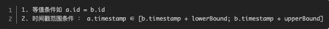 将 leftStream 与 rightStream 进行 Interval Join。(在流与流的 join 中, window join 只能关联两个流中对应的 window 中的消息,跨窗口的消息关联不上,所以摒弃。Interval Join 则没有 window 的概念,直接用时间戳作为关联的条件,更具表达力。Interval join 的实现基本逻辑比较简单,主要依靠 TimeBoundedStreamJoin 完成消息的关联,其核心逻辑主要包含消息的缓存,不同关联类型的处理,消息的清理,但实现起来并不简单。一条流中的消息,可能需要和另一条流的多条消息关联,因此流流关联时,通常需要类似如下关联条件:)。