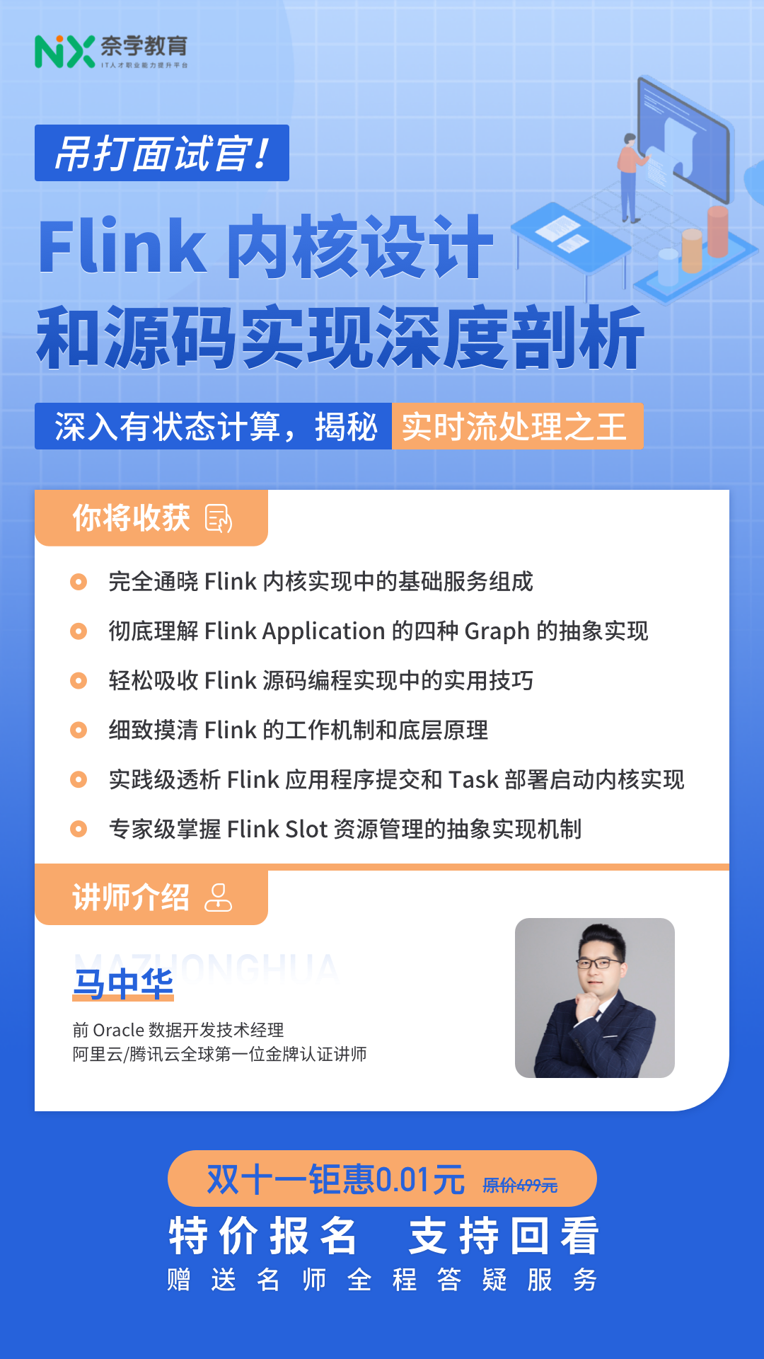 主讲马中华老师,是阿里云/腾讯云认证的全球首位金牌讲师,在 Oracle 有多年的大数据开发经验。跟着他学习 Flink 的源码架构与内核,有问题就在直播间和群里随时提问,几乎没有什么好顾虑的。况且,前转转公司大数据资深架构师、Hadoop平台负责人李希沅老师也会加入授课,解答你所以大数据的核心问题。