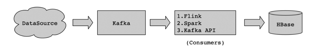 一般业务场景如下,数据源头产生数据,进入Kafka,然后由消费者(如Flink、Spark、Kafka API)处理数据后进入到HBase。这是一个很典型的实时处理流程。流程图如下: