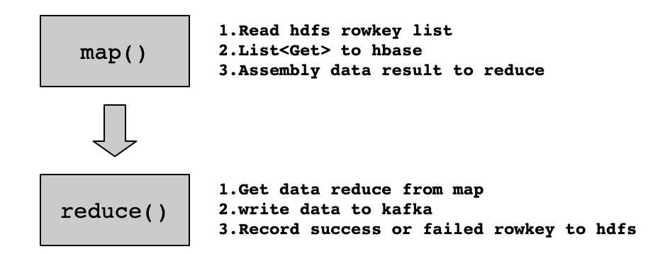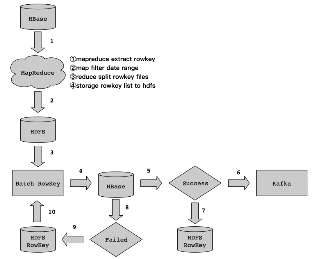 通过MapReduce任务写数据到Kafka中,可能会有失败的情况,对于失败的情况,我们只需要记录Rowkey到HDFS上,当任务执行完成后,再去程序检查HDFS上是否存在失败的Rowkey文件,如果存在,那么再次启动步骤10,即读取HDFS上失败的Rowkey文件,然后再List