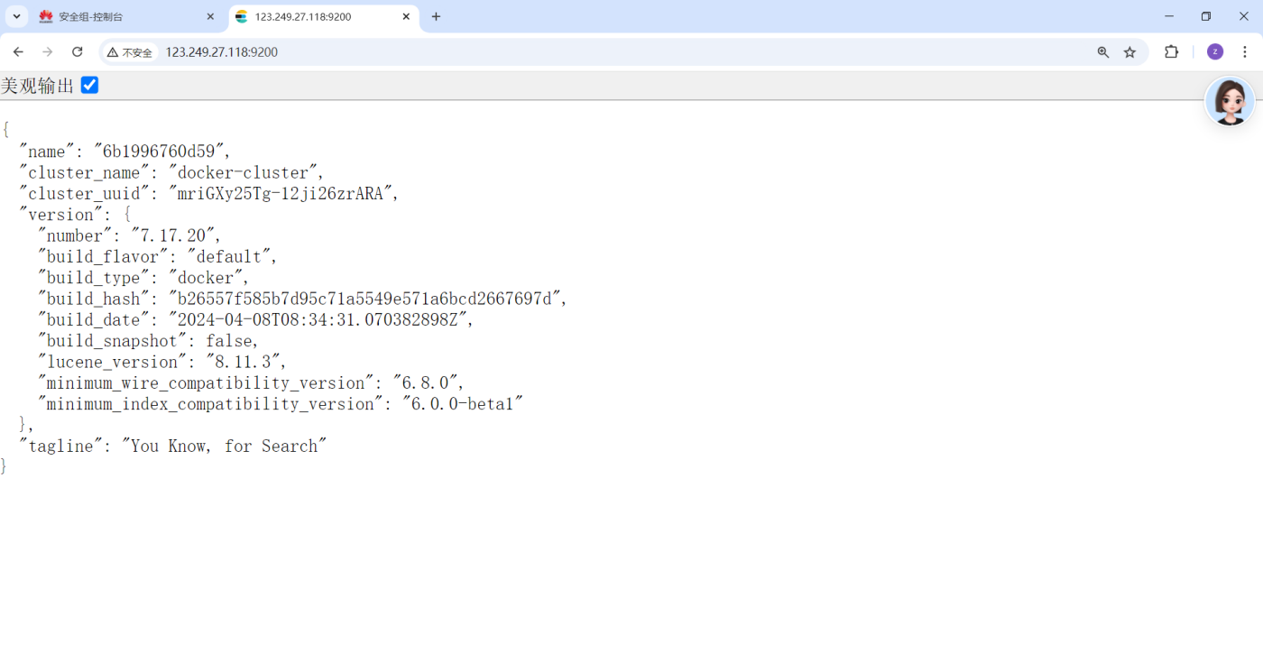 [root@flexusx-251f ~]# docker run -itd \ --name es \ -e "ES_JAVA_OPTS=-Xms512m -Xmx512m" \ -e "discovery.type=single-node" \ -v es-data:/usr/local/elasticsearch7.17.20/data \ -v es-plugins:/usr/local/elasticsearch7.17.20/plugins \ -v es-logs:/usr/local/elasticsearch7.17.20/logs \ --privileged \ --network es-kb-net \ -p 9200:9200 \ -p 9300:9300 \elasticsearch:7.17.18