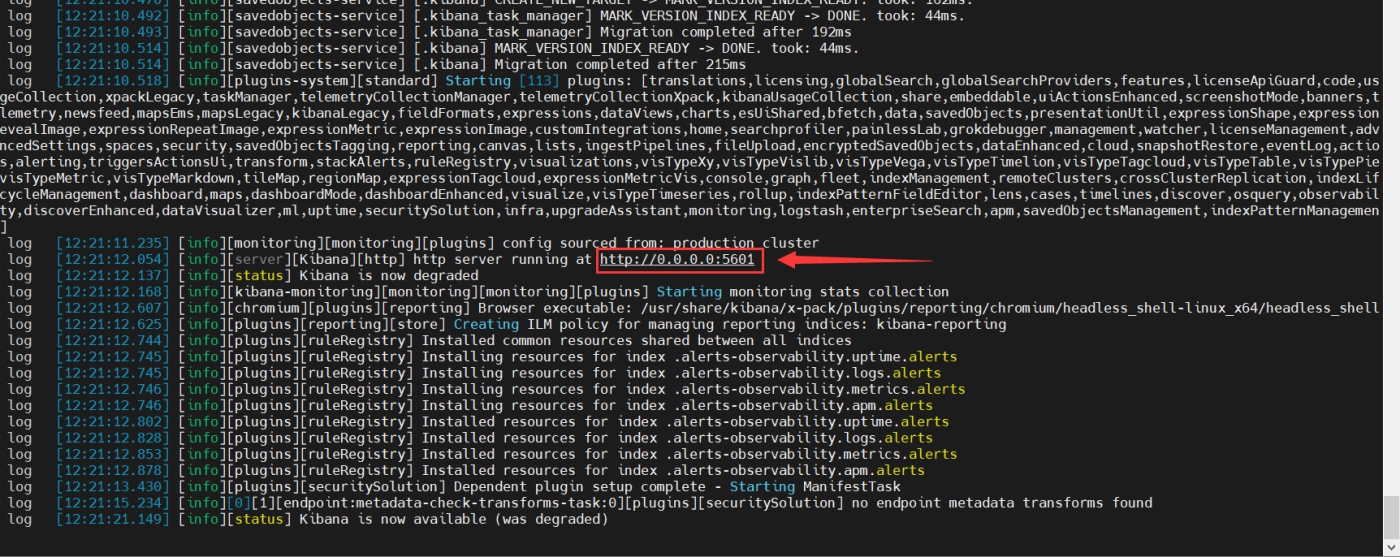 [root@flexusx-251f ~]# docker run -itd --name kibana -e ELASTICSEARCH_HOSTS=http://es:9200 --network=es-kb-net -p 5601:5601 kibana:7.17.20