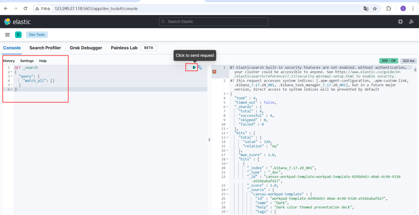 在左边的控制台输入框中输入如下命令,然后点击右上角的三角形按钮执行请求即可在右边的界面看到查询结果。