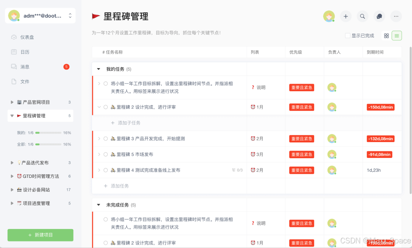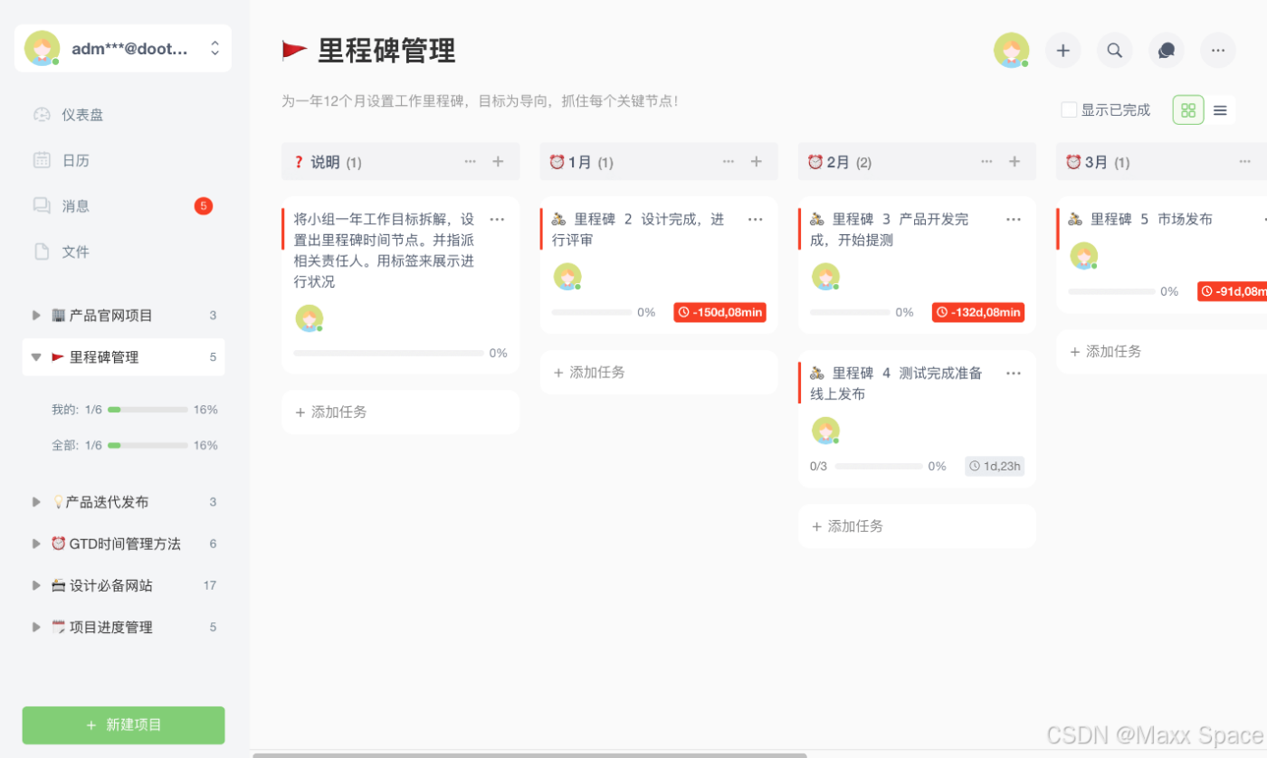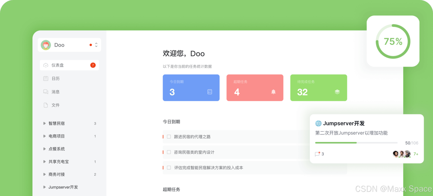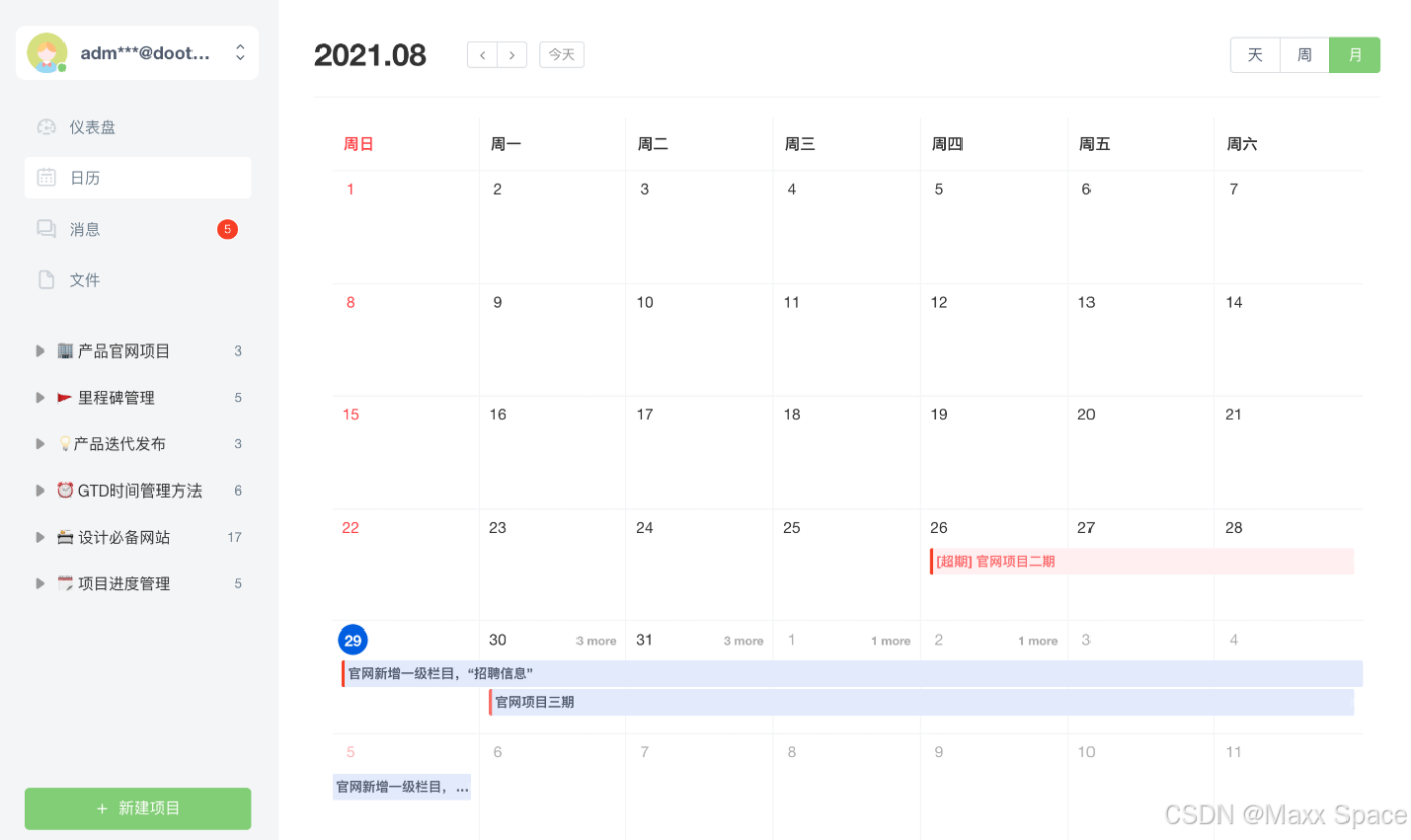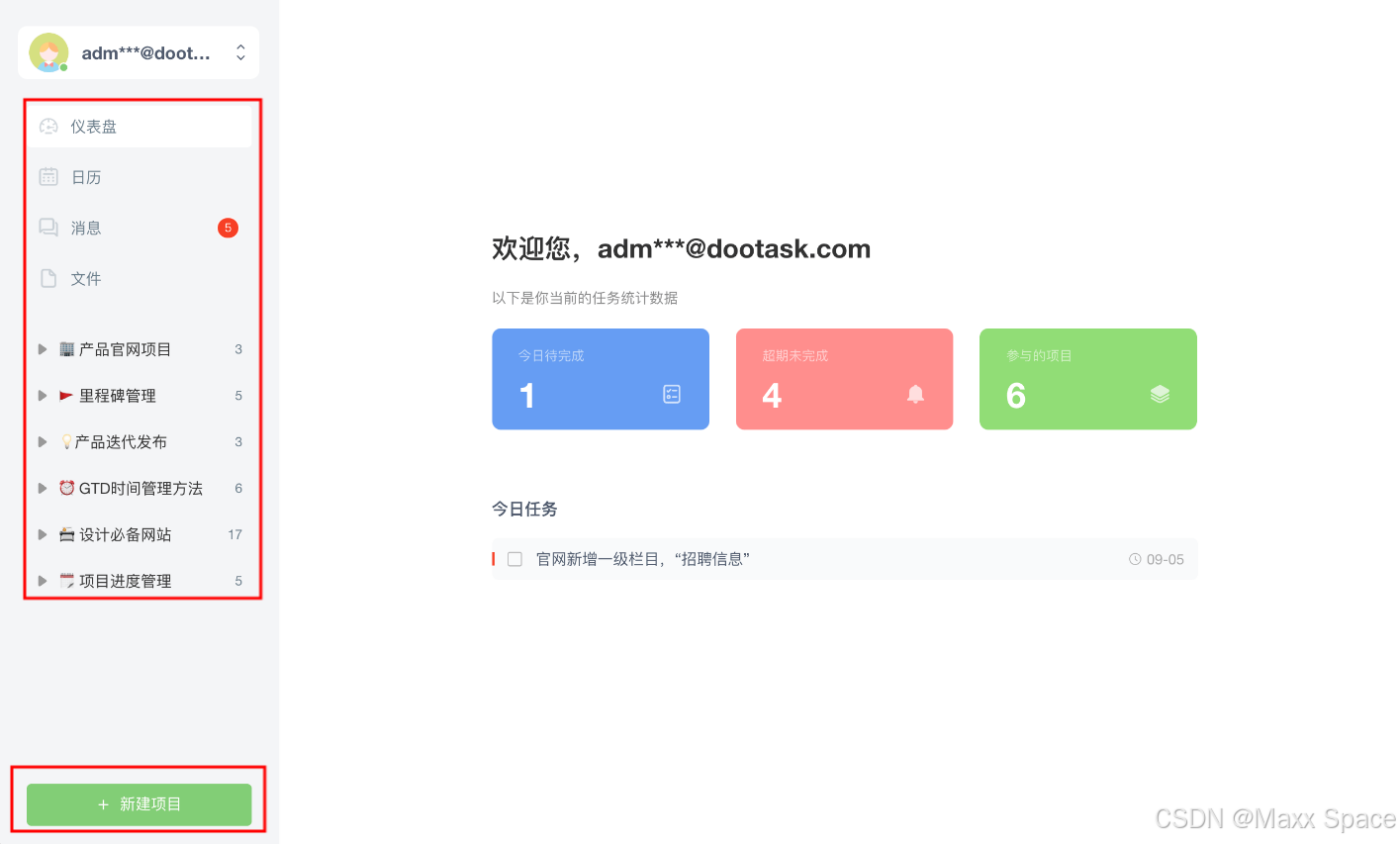 仪表盘主要展示项目概述信息:显示任务统计数据(显示今日到期任务、超期任务、待完成任务)和左侧功能栏:日历、消息、文件、项目列表和新建项目功能