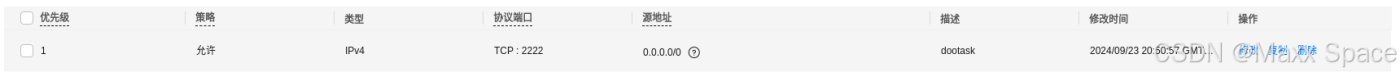 在 Flexus 云服务器 X 实例的安全组管理页面,添加入方向规则,接下来我们启动服务需要监听 2222 端口,所以添加安全组为 TCP:2222 协议端口。