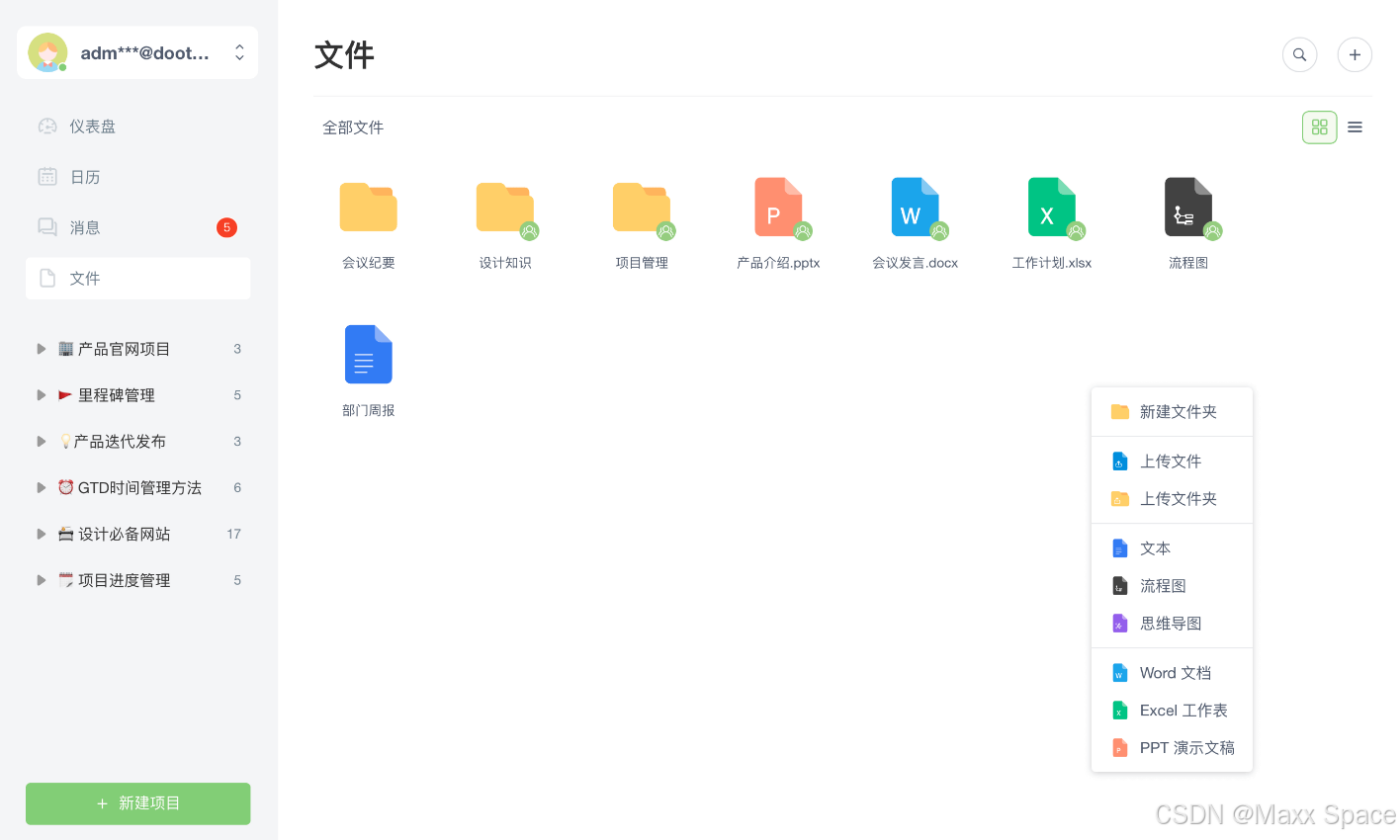 左侧点击【文件】,显示和查看项目相关文件,点击页面右上角【新建文件】图标按钮,即可新建文件夹/上传文件/上传文件夹,目前系统支持文本、图标、思维导图、Word 文档、Excel 工作表、PPT 演示文稿多种文件类型。