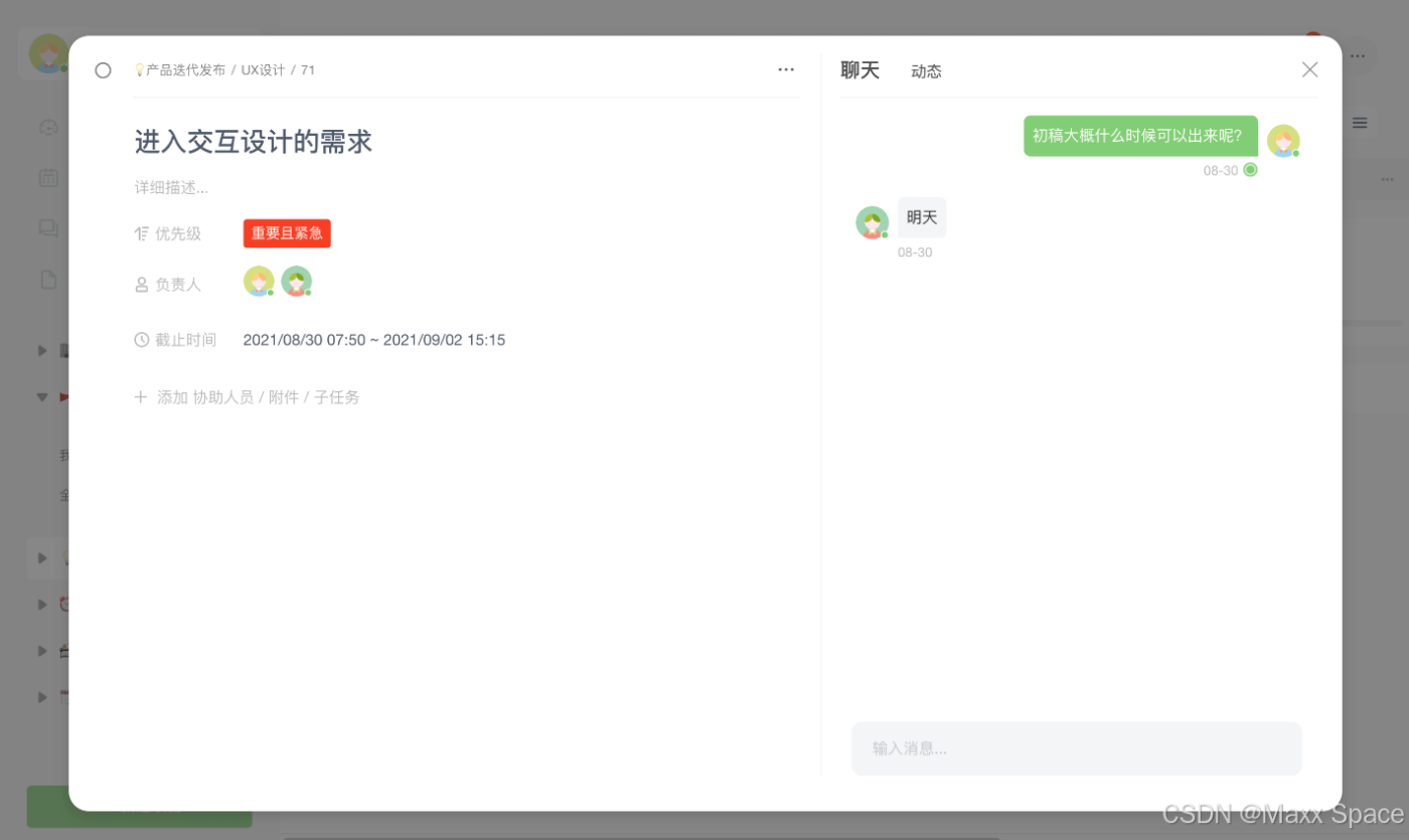 选择对应任务,打开任务详情页,在页面右侧聊天窗口输入框中输入关联的文件链接/任务,点击【发送】图标即可引用。