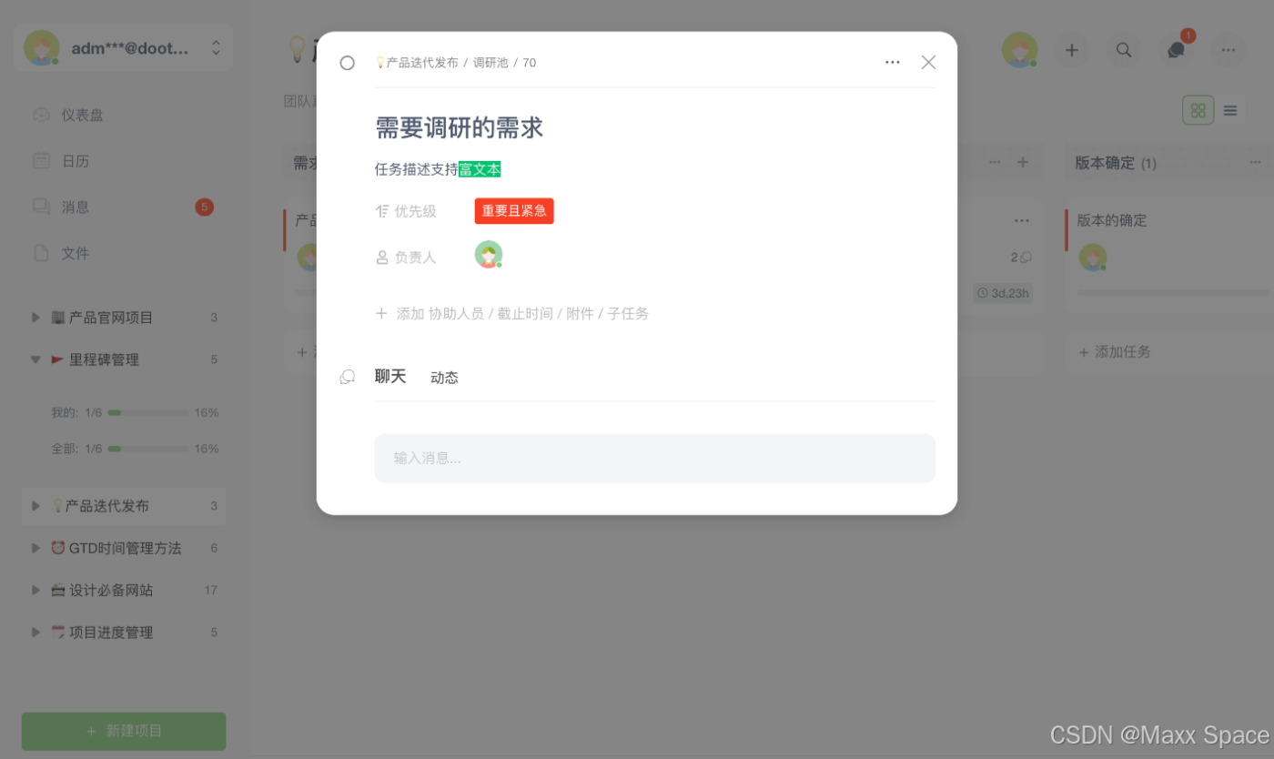 Dootask 是一个开源的项目管理工具,类似于 Jira、Trello 等工具,但它是基于 Web 的,并且完全开源。DooTask 模版满足多种团队协作场景,同时支持自定义模版,满足团队个性化场景管理需求,可直观的查看项目的进展情况,团队协作更方便。功能非常全面,提供了任务管理、项目管理、IM、文件管理等功能,并且效果超级赞!