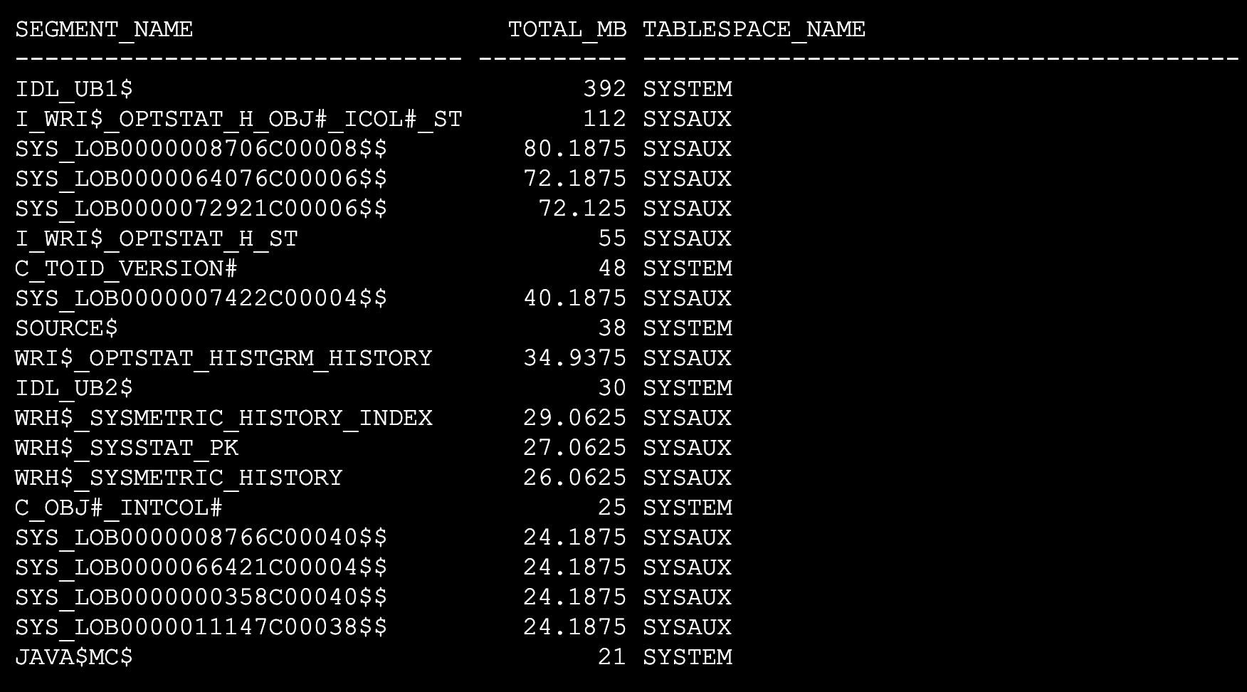 使用SYSTEM和SYSAUX表空间的比较大的表有哪些呢?
