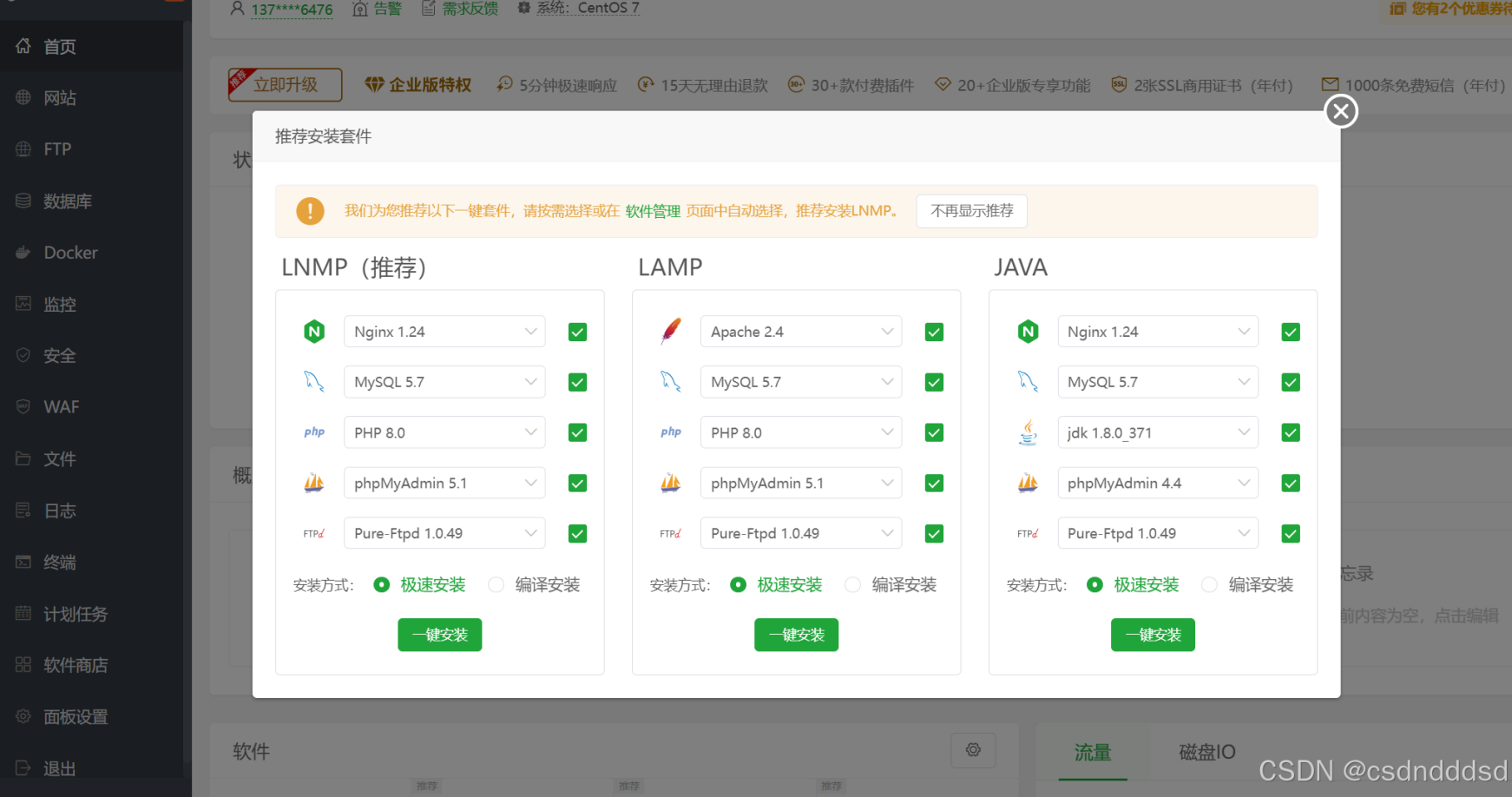3、在宝塔里面安装必要的环境 PHP7.3、Mysql5.6+、NGINX