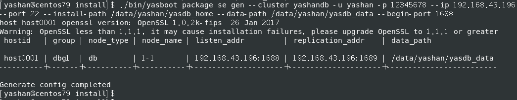 [yashan@centos79 install\]$ ./bin/yasboot package se gen --cluster yashandb -u yashan -p 12345678 --ip 192.168.43.196 --port 22 --install-path /data/yashan/yasdb\_home --data-path /data/yashan/yasdb\_data --begin-port 1688