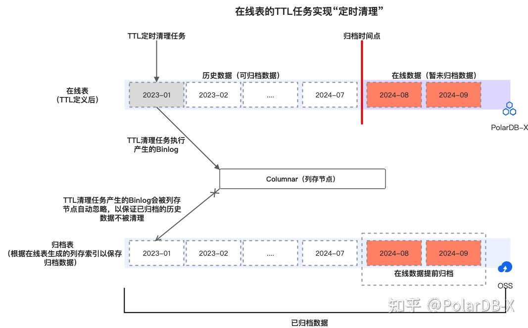 PolarDB-X v2.4.1提供了全新的数据TTL能力,支持行级、分区级的数据过期清理、归档等,可以结合列存索引适配oss对象存储,可以提供更灵活的数据TTL。