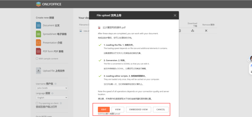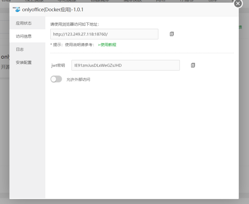 [root@flexusx-251f ~]# docker pull onlyoffice/documentserver #编写 docker-compose 文件[root@flexusx-251f dk_onlyoffice]# cat docker-compose.ymlversion: '3'services: onlyoffice: image: onlyoffice/documentserver container_name: onlyoffice ports: - ${PORT}:80 environment: - JWT_ENABLED=true - JWT_SECRET=${JWT_SECRET} volumes: - ${DATA_PATH}/logs:/var/log/onlyoffice - ${DATA_PATH}/data:/var/www/onlyoffice/Data #编写配置文件[root@flexusx-251f dk_onlyoffice]# cat .envPORT=18760JWT_SECRET=IE91zmJusDLxWeGZsJHDDATA_PATH=/www/dk_project/dk_app/dk_onlyoffice#创建容器[root@flexusx-251f dk_onlyoffice]# docker-compose up -d#查看容器[root@flexusx-251f dk_onlyoffice]# docker-compose psNAME IMAGE COMMAND SERVICE CREATED STATUS PORTSonlyoffice onlyoffice/documentserver "/app/ds/run-documen…" onlyoffice 4 minutes ago Up 3 minutes 443/tcp, 0.0.0.0:18760->80/tcp, :::18760->80/tcp