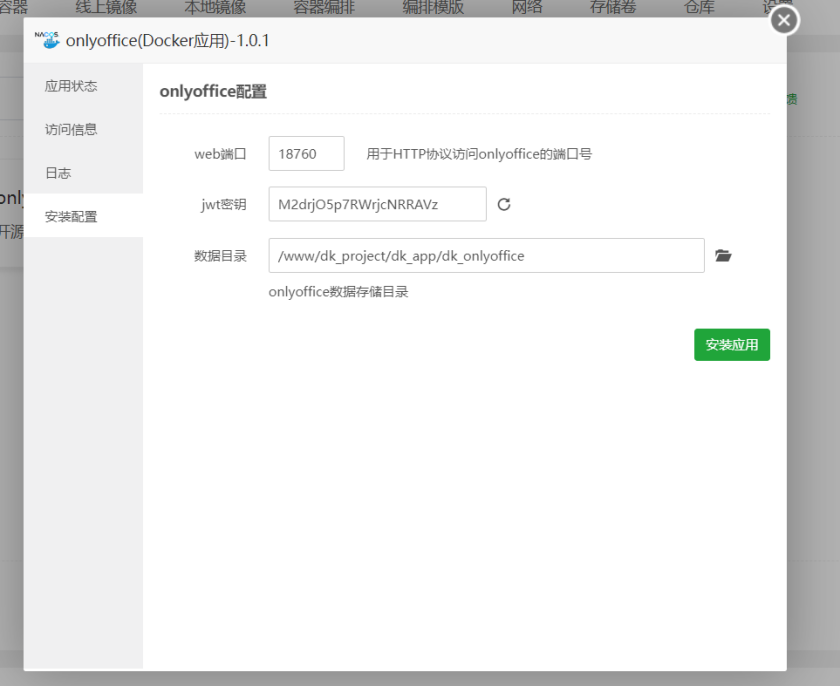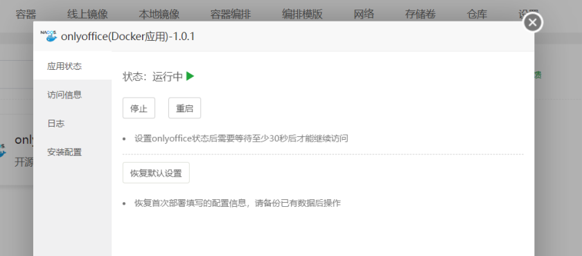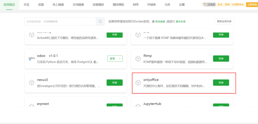 • 点击左侧导航栏 Docker(如果没有安装 Docker,点击一键安装即可),在应用商店搜索容器 onlyoffice