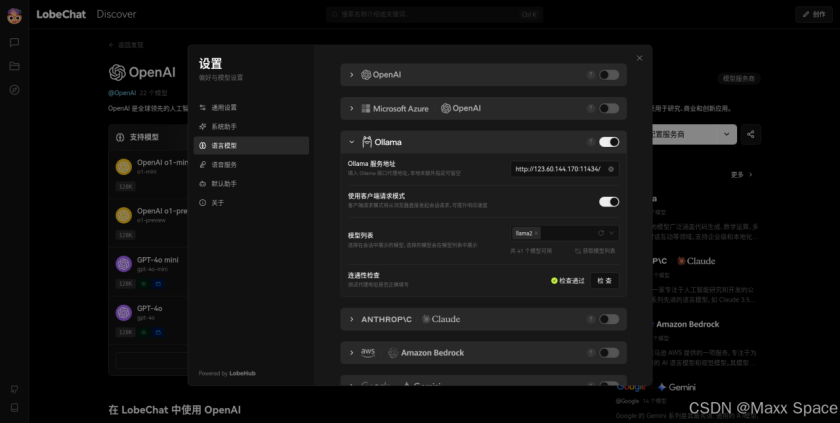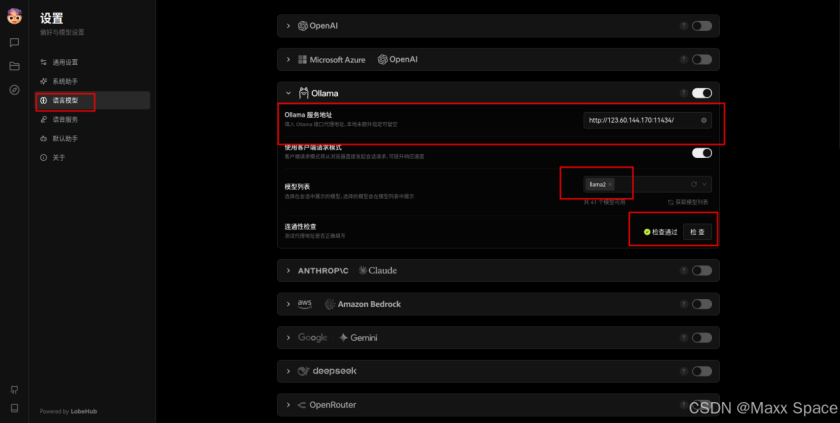 我这里配置的是 Ollama 的本地模型服务,填写 Ollama 服务地址,并测试下联通性,通过即可