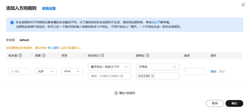 主要需要填写优先级(默认填 1 即可)、协议端口(协议一般为 TCP 或 UDP,端口一般选择你项目需要暴露的端口即可),描述(选填,一般会填写此端口的用途以免忘记了),其他默认点击确定即可。安全组配置主要是暴露端口可以给外网访问。