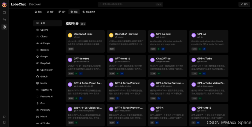 列表展示超多的模型,按照模型服务商分类展示其旗下的各种模型