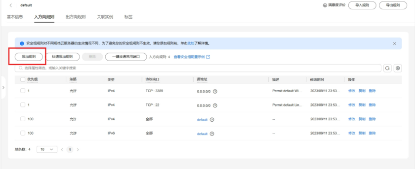 系统为每个网卡默认创建一个默认安全组,默认安全组的规则是对出方向上的数据报文全部放行,入方向访问受限。您可以使用默认安全组,也可以根据需要创建自定义的安全组。