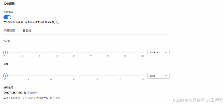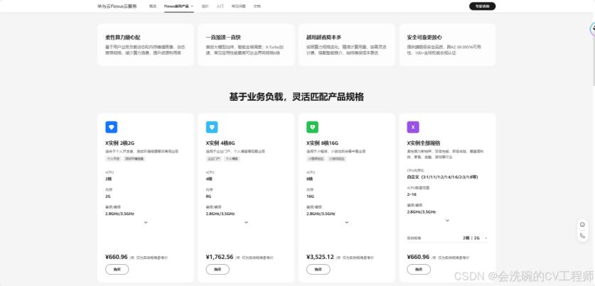 Flexus云服务器X实例是华为云推出的一款面向中小企业和开发者的柔性算力云服务器。这款服务器的主要特点是其灵活的 vCPU 内存配比,支持热变配不中断业务变更规格,以及能够智能感知业务负载并自动调整资源配置,如下图。
