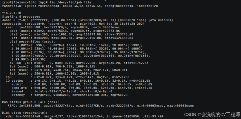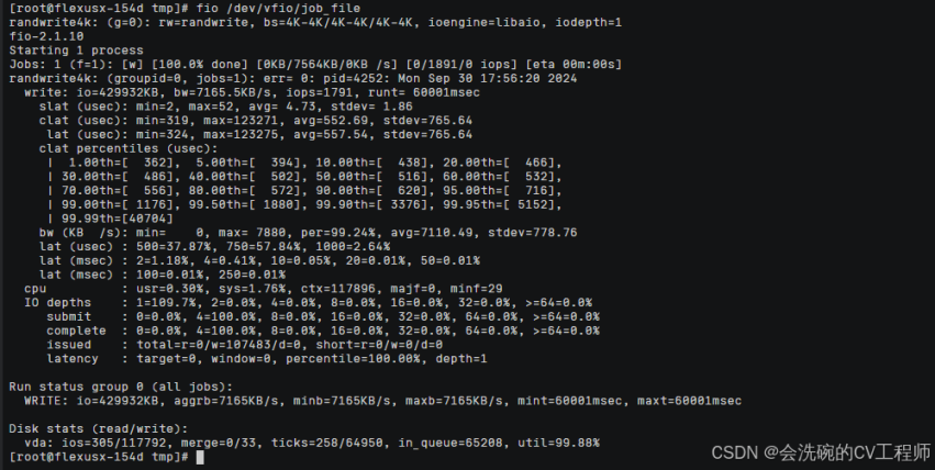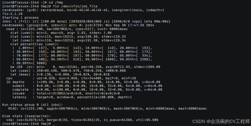 此外,测试还提供了时延的百分位数数据。例如,99.99%的 I/O 操作在 987136 微秒(即 0.987 毫秒)内完成,但需要注意的是,这里的 99.99%百分位数实际上受到了极端值的影响,因为大部分操作的完成时延都远低于这个值。