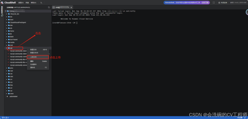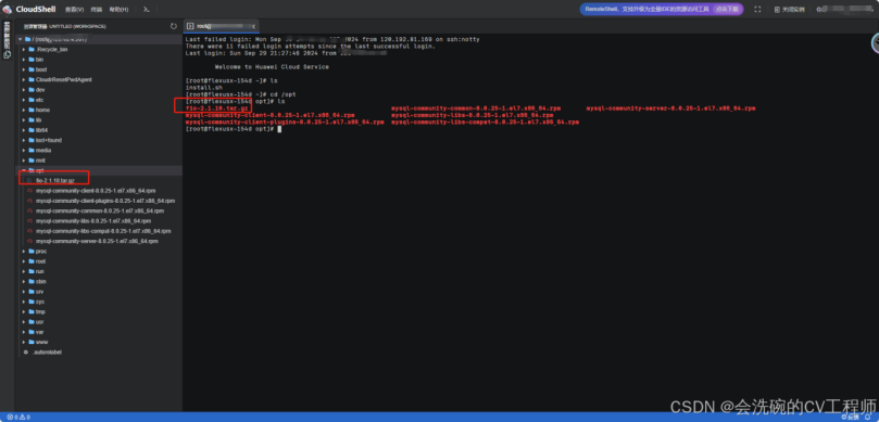接下来我们上传到服务器中,还是老规矩,我们使用 cloudshell 远程登陆我们的服务器。接下来我们将刚刚下载的 FIO 压缩包上传到服务器的 opt 目录下:如下图所示: