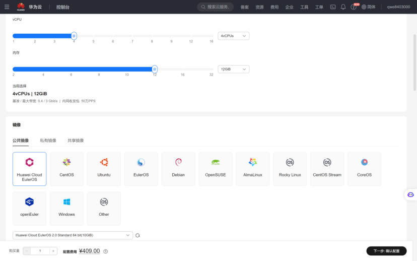 这里使用的是 4vCPUs 与 14GIB 的内存,镜像选择的是默认的公共镜像。这个镜像有两个选项,一个是 10GiB 与 40GiB,我就默认选择 10GiB 了。