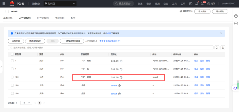 在这里我们可以看到 3306 的端口号已经添加过了所以可以直接访问的,如果没有的话是无法访问的,安全性是可以信赖的。