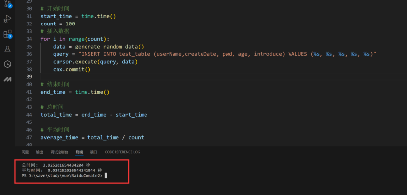 100 条的平均时间是 39 毫秒,这就代表连续插入的速度还是比较快的呢。