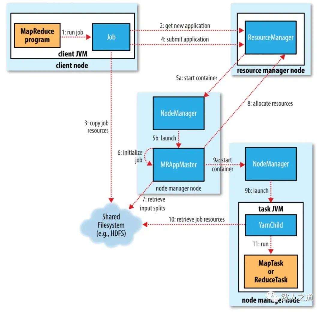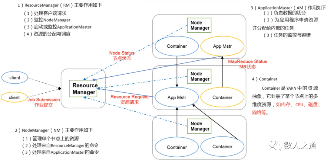 以更专业的角度解释,AM负责向RM索要NM执行任务所需要的资源容器,更具体来讲是AM负责从Scheduler申请资源,以及跟踪这些资源的使用情况以及任务进度的监控。