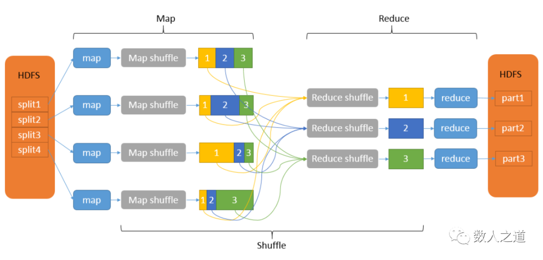 其中Map将输入的原始数据集转化为Key-Value(键-值对),拆分给不同节点并行进行指定的计算操作(例如排序、聚集),形成中间结果,这个计算操作的过程称为Map shuffle;Reduce则并行地对生成的中间结果中相同的Key的所有Value进行规约合并汇总处理后,输出新的Key-Value得到最终结果,这个处理相同Key的过程称为Reduce shuffle. 可以看出,在Map和Reduce中间,其实还有一个过程,就是对Map的输出进行整理并交给Reduce,这个过程就是shuffle. Map和Reduce操作需要我们自己定义相应的Map类和Reduce类,而shuffle则是系统自动帮我们实现的。