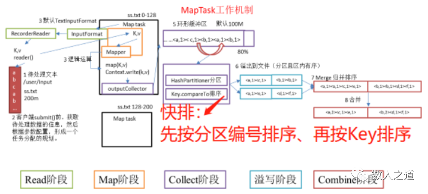 每个Map Task处理输入数据集合中的一片数据(InputSplit),并将产生的若干个数据片段写到本地磁盘上。Map Task整体计算流程分为以下五个阶段(其中最后三个阶段就是上面提到的 Map shuffle):