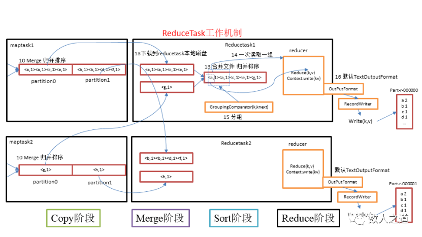 Sort阶段:按照MapReduce语义,用户编写的reduce()函数输入数据是按Key进行聚集的一组数据。为了将Key相同的数据聚在一起,Hadoop采用了基于排序的策略。由于各个Map Task已经实现对自己的处理结果进行了局部排序,因此,Reduce Task只需对所有数据进行一次归并排序即可。