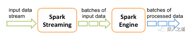 为数据流处理而生,类似的还有Storm(准实时). 其原理是把接收到的数据流分很多小的批次(batches),然后分批处理输出,称为微批处理(非真正的准实时),且其处理计算过程是在内存中完成的,比MapReduce需要利用HDFS磁盘空间的离线批处理效率提高很多: