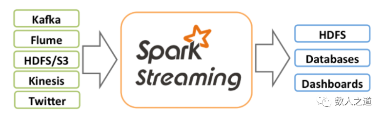 Spark Streaming的数据源可以是Kafka,Flume等,流处理过程中可以使用MLib库进行一些机器学习方面的建模等工作: