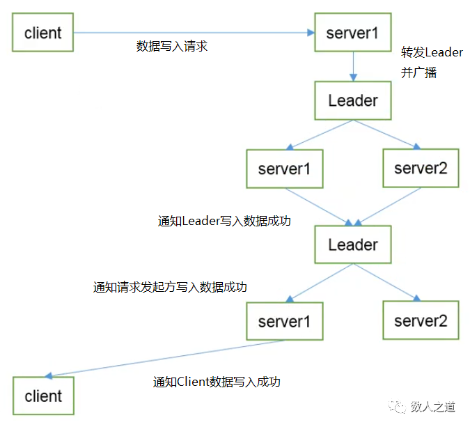 Client 向 Zookeeper 请求写入数据时,要先写入 Leader,若收到请求的机器不是 Leader,则写入数据的请求会转发给 Leader