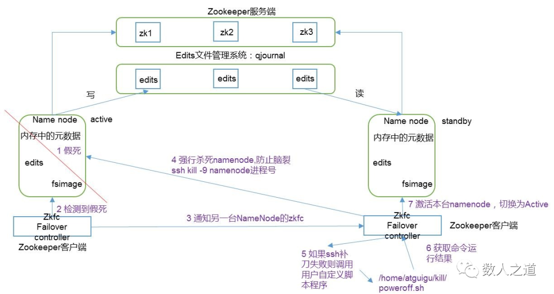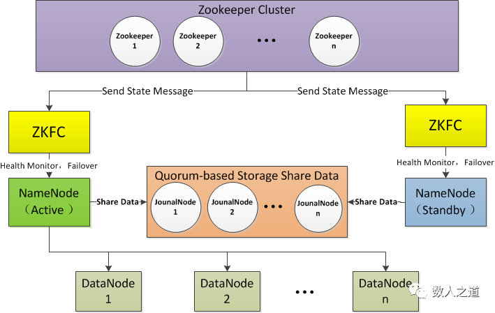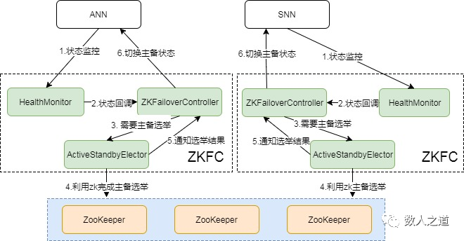 要完成 HA,除了元数据同步外,还得有一个完备的主备故障自动切换机制,这个机制就是依赖于 Zookeeper 集群的主备选举机制,而整个切换的过程由 ZKFC 来进行控制。