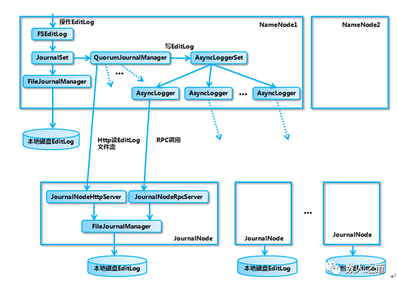 元数据的同步主要是要保证主备 NameNode 的元数据是保持一致的,即保证磁盘镜像(FSImage)和日志(EditLog)在备 NN 上也是完整的,而元数据的同步很大程度取决于 EditLog 的同步,而这步的关键就是共享存储系统。