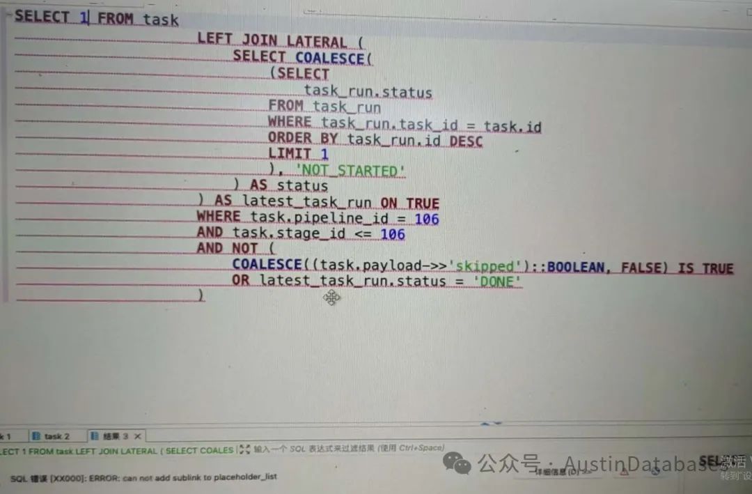 在看完这个SQL后,我不知道各位看官怎么想,我的想法是,够狠,够虐,够聪明。从多年的SQL观察和优化的角度,这个SQL的撰写者并不一般,这是一个知名的软件中我们运行出现问题的SQL,执行中报错,报can not add sublink to placeholder_list。