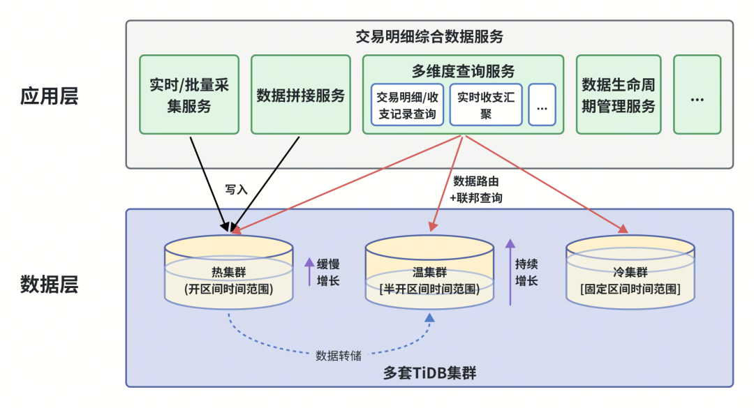由于 TiDB 的设计哲学是在标准硬件基础上通过多副本+Multi Raft 分布式一致性协议实现可用性和性能间的平衡,且副本数至少 3 个起步,部分高等级业务甚至需要 5 副本提供更高的可用性。所以,单副本 500TB 迁移至 TiDB 后即使采用了多层压缩,因副本数的变多整体容量势必会有一定的增长(该场景 5 副本经过压缩约为原始数据的 2 倍)。面对如此大数据规模、面向全渠道/数亿客户、TPS 超过万级/访问延迟毫秒级、并且混合了客户号/账号/机构信息多维度访问的重要业务系统,为了在 SLA、扩展性、整体成本等方面寻求最佳平衡点,整体数据架构采用了最贴合业务特征的方式做水平拆分,即按交易时间维度拆分为多个物理集群,不同集群可根据 SLA 等级对应不同的资源规格和副本数,并通过应用层的数据路由、联邦查询组件实现跨库背景下的 SQL 访问快速定位、结果集归并、路由策略管理等核心功能。