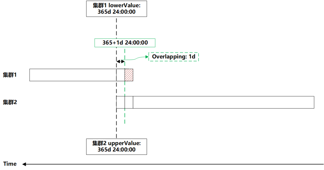 集群间数据冗余设计:热、温集群间的 ETL 作业会遵循“热集群导出[交易日期 < (now - 365d)]数据-->温集群导入-->热集群清理[交易日期 < (now - 365d)]”的时序,也就是数据转储是有时延的、并且存在因异常导致时延增大的可能。如果热、温集群“开口部分的相对时间”卡的过死,会出现 ETL 导入完成前客户查不到数据的“幻象”。所以,在设计上引入了名义时间、冗余时间、实际时间的概念,比如热集群名义最小时间(lowerValue)为[now - 365d],考虑到上述的时延因素,将冗余时间(overlapping)设定为 1 天,即该集群实际存储并提供服务的最小时间为[now - 365d - overlapping],相应的,温集群提供服务的最大时间也为该值,如图 2 中的绿色虚线。不难看出,只要冗余时间设定的相对合理、稳妥,就可以覆盖 ETL 产生的各类边界场景。