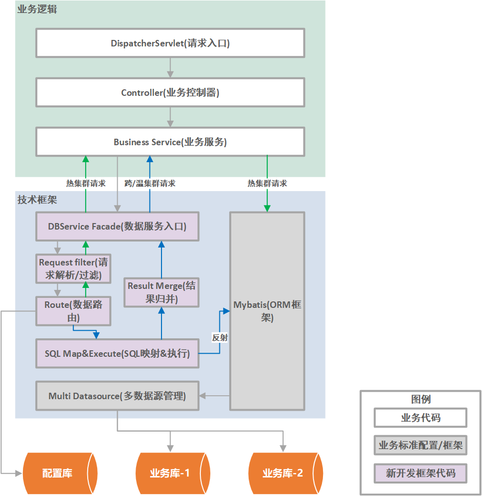 主要变化包括 ORM 框架(如 Mybatis)的 SQL 语句部分按规则预留供路由组件改写的动态参数,以及调用方式改为通过路由组件提供的入口方法,对于仅访问热集群或无需改写 SQL 参数的场景,路由组件会调用业务侧上送的回调函数直接执行原始的 ORM 操作。对于跨集群的场景,由路由组件基于反射技术调用上送的 Mybatis mapper 中对应的业务 SQL,并将执行结果处理后返回调用方;