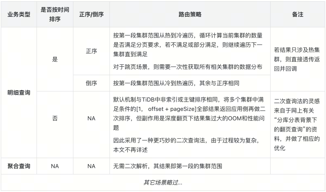 动态路由解析:采用两段式路由的机制。第一段先通过请求参数中的业务类型、查询的日期范围,结合动态计算的每个集群当前的上下界时间,确定当前请求涉及的集群范围。第二段是进行更细粒度的路由,对于只涉及热集群的场景,直接透传返回并在不改写参数的情况下回调原始 SQL;对于多集群场景,则会涉及业务类型、是否按时间排序、正序/倒序、是否跳页多个维度的组合。如表 1 所示: