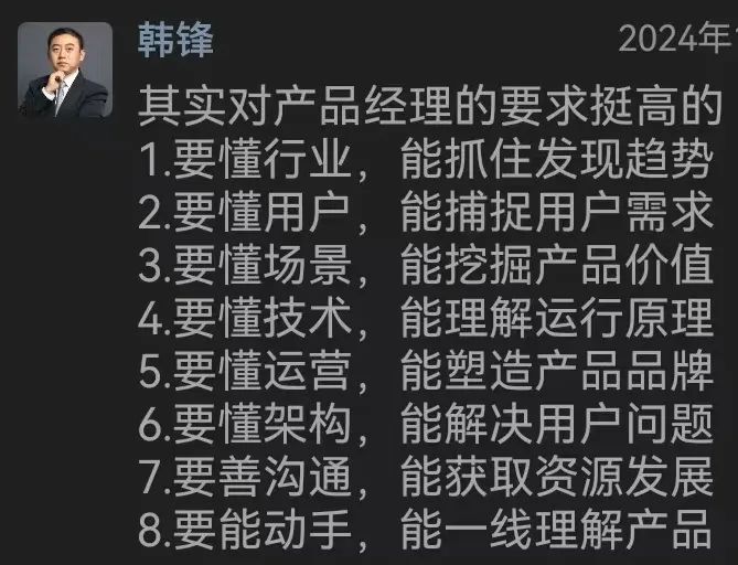 2024年,对个人职业发展来说,今年减少了不少外出,更多开始沉下心来做更多的思考,从产品、市场、运营、架构角度希望能有更多的收获,但这方面做的并不好,感觉成长进步不大,希望在新的一年能有所突破。下面以自己朋友圈发的一张对产品经理的能力思考,作为收尾。