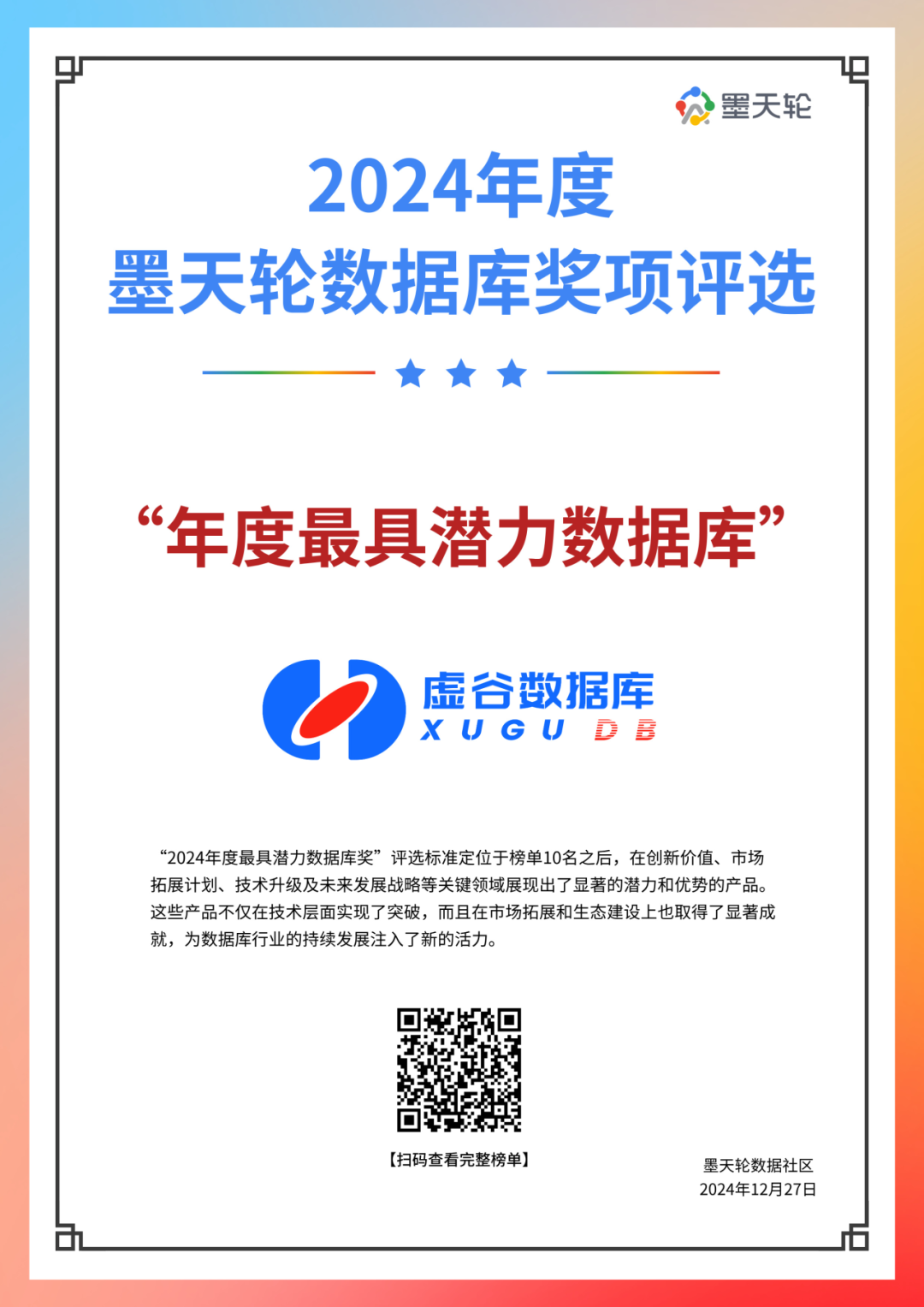 12月27日,墨天轮社区正式揭晓了2024年度数据库获奖名单。此次评选中,虚谷数据库凭借其卓越的技术实力和市场表现,荣获“2024年度最具潜力数据库”奖项,成为本年度数据库领域的闪耀之星。
