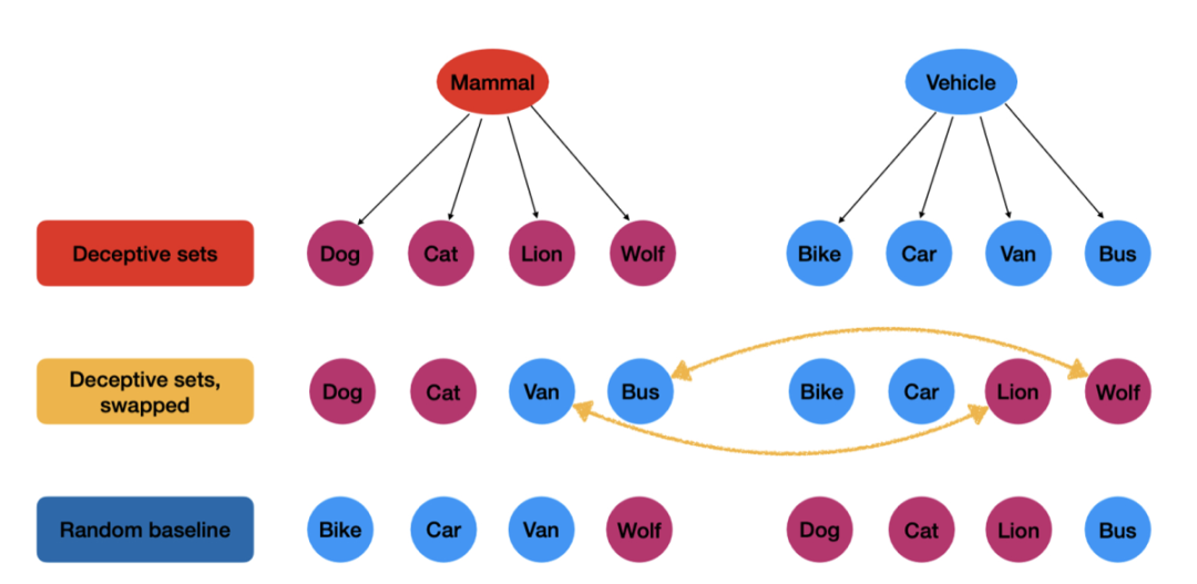 为了评估大语言模型对集合成员语义变化的鲁棒性,亚马逊研究人员及其同事通过对上位词对(例如“哺乳动物”和“车辆”)进行采样,创建了“欺骗性”集合,并从中提取三种不同条件下的下位词: